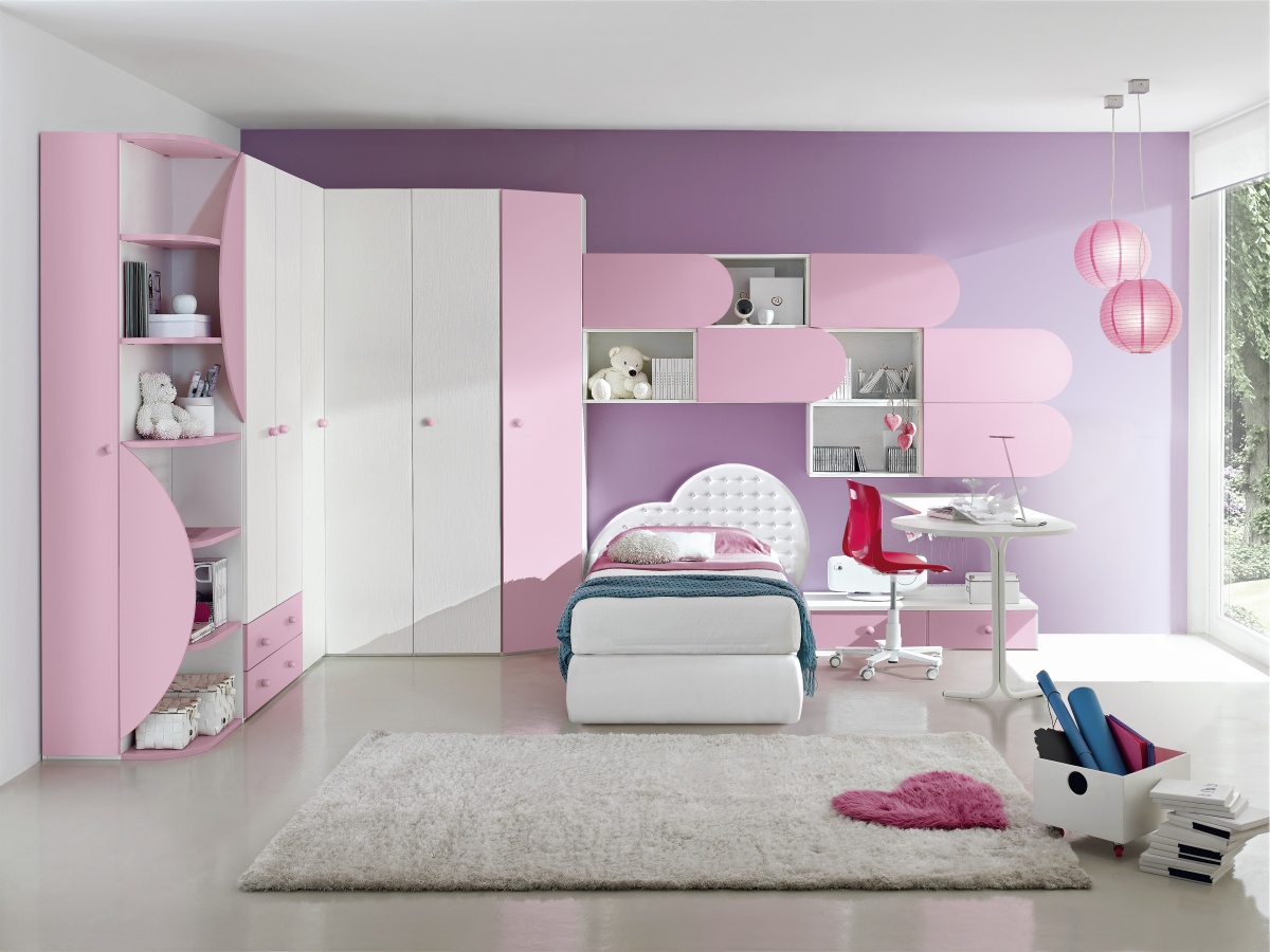 Rosa e bianco i colori per una cameretta “dolcissima”. Armadio angolare per una grande capienza, letto contenitore per riporre tutti i giochi della tua principessa